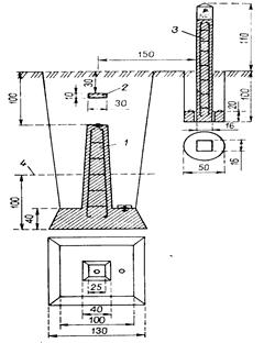 Рис. 11.4 Грунтовый репер (тип 5): Рис. 11.5. Фундаментальный репер 1— железобетонный пилон с маркой и якорным устройством; 2— граница промерзания (оттаивания грунта); 3— опознавательный знак.