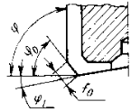 Рис. 51. Углы в плане торцовых фрез. Рис. 50. Формы остроконечных зубьев Спинка зуба (рис.50, в) выполняется по дуге окружности радиусом. R = 0,3…0,45D. При выборе его необходимо, чтобы касательная в точке А сопряжения ее с ленточкой f проводилась под углом a 1 на 10…15° больше, чем задний угол a. Форма зуба (рис.50, б) имеет спинку, выполненную под двумя углами: a - задний угол, a1 = 20…30° – угол среза спинки. Высота зуба h и радиус округления r выбираются в тех же пределах, что и для зуба третьей формы. В зависимости от размеров зуба фаску f выполняют равной 1…2 мм, а дополнительную величину затылка F определяют графическим путем. Углы режущей части зуба. Выбор оптимальных углов режущих элементов фрез зависит главным образом от назначения фрезы, свойств обрабатываемого материала и технологических условий обработки. Задний угол предназначен для устранения трения задней поверхности зуба об обрабатываемую поверхность в процессе резания. Главный угол a и вспомогательный угол a1 (рис.50) задают в нормальном сечении к оси цилиндрической или угловой фрезы. Задний угол в нормальном сечении на винтовых зубьях определяется по формуле tgaN = tga/cosw. Задний угол на фасках прорезных и дисковых фрез в сечении, параллельном фаске, определяется по формуле tgaN = tgasinj, где j – угол фаски. Для фрез с мелкими зубьями (снятие небольших припусков) задний угол принимается равным 16°, для фрез с крупным зубом – 12°, для фрез дисковых, прорезных (шлицевых) – до 30°. Для получения высокого класса чистоты обрабатываемой поверхности рекомендуется для фрез из твердого сплава задний угол выбирать в пределах 5…8°. Кроме главной режущей кромки некоторые типы фрез имеют еще и вспомогательную. Задний угол a1 на вспо-могательной кромке принимается в пределах 4…8°. Для концевых фрез выбор угла a1 связан с углом в плане j1 вспомогательно- режущей кромки. Если фреза снабжена торцовыми зубьями с j1 = l°30', то a1 в этом случае берется равным 6…10°. При отсутствии торцовых зубьев угол j1 увеличивается до 8°, а угол a1 = 0, так как угол j1 частично выполняет роль угла a1. Передний угол предназначен для уменьшения нагрузки на режущую кромку в процессе резания. Он выбирается в зависимости от физико-механических свойств обрабатываемого материала и характеристики материала инструмента. Для фрез с винтовым зубом выбор переднего угла g связан с углом наклона режущих зубьев w. С увеличением угла наклона зубьев разница между фактическим передним углом gф и углом в нормальном сечении gN резко возрастает. Ее можно определить по формуле