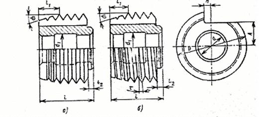 Резьбовые резцы нарезают резьбу за несколько рабочих ходов (проходов). Производительность резьбонарезания низкая. Вследствие этого их в основном применяют в единичном и мелкосерийном производстве для изготовления как наружных, так и внутренних резьб значительной длины или же большого диаметра. При нарезании резьбы резец относительно детали совершает винтовое движение с заданным параметром резьбы. Обычно деталь вращается вокруг своей оси, а резец равномерно перемещается вдоль оси детали и за каждый рабочий ход имеет радиальное врезание. Окончательно резьба формируется на последнем рабочем ходу, когда режущие кромки лежат на заданной винтовой поверхности. Резьбовые резцы бывают стержневые, призматические и круглые. Призматические и круглые резцы рассчитывают и устанавливают относительно детали так же, как и фасонные резцы. Для уменьшения числа рабочих ходов и повышения производительности труда применяют резьбовые гребенки. Их используют для изготовления крепежной и другой резьбы с мелким шагом. Рабочая часть гребенки имеет 6 – 8 шагов резьбы. Из них 1,5 – 2 шага расположены на режущей части и 4,5 – 6 шагов – на калибрующей части. Число рабочих ходов при нарезании резьбы гребенками уменьшается в 2 – 3 раза по сравнению с резьбовыми резцами. При каждом рабочем ходе гребенка радиально врезается в заготовку и за каждый ее оборот перемещается на один шаг вдоль оси заготовки. Резьбовые гребенки подразделяют на призматические и круглые ( для наружной и внутренней резьбы). Получили более широкое применение круглые гребенки, как более простые в изготовлении и допускающие большое число переточек. Круглые гребенки обычно делают насадными. Их конструктивные размеры определяются также, как и фасонных резцов. Круглые гребенки бывают с кольцевыми витками и винтовыми (рис. 52.).