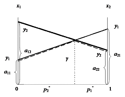 Решению игры 2×2можно дать геометрическую интерпретацию. Средний выигрыш игрока 1 при стратегии y 1 равен решение.