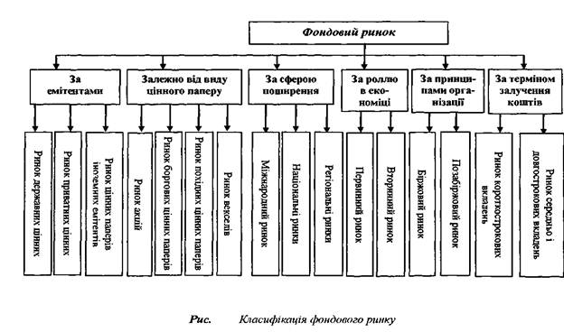 За формою існування цінні папери поділяються на документарні та без документарні. Цінні папери в документарній формі повинні містити реквизити, що визначені законодавством, і мати відповідні форми захисту від підробок. Цінні папери в без документарній формі існують як одиниці облік}' в комп'ютерній системі і обертаються у формі переказів з рахунків одних учасників фондового ринку на рахунки інших. Зазначені особливості цінних паперів визначають види операцій з ними та умови їх проведення. Фондовий ринок є системою, що об'єднує окремі самостійні ринки. Класифікація фондового ринку наведена на рис. 3. Професійними учасниками фондового ринку є торговці цінними паперами, брокерські контори, компанії з управління активами, депозитарії, зберігачі, реєстратори прав власників цінних паперів, фондові біржі та торговельно-інформаційні системи, які одержали ліцензії на здійснення певного виду професійної діяльності на ринку. Депозитарії, зберігачі, реєстратори власників цінних паперів, фондові біржі та торговельно-інформаційні системи є інфраструктурними учасниками фондового ринку, які створюють умови для укладення угод з цінними паперами та забезпечують їх обслуговування. їх функціями є ведення рахунків з цінними паперами та реєстрів власників цінних паперів, забезпечення розрахунків за угодами з фондовими цінностями та їх відповідальне зберігання, створення умов для укладення угод з цінними паперами на організованому фондовому ринку.