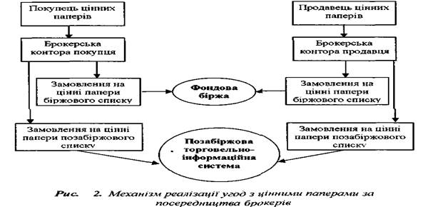 Брокерські контори відкриваються засновниками фондової біржі або юридичними особами, які придбали місце на біржі. Кожен член фондової біржі має право відкрити одну брокерську контору, яка може функціонувати у формі самостійної юридичної особи або як структурний підрозділ члена фондової біржі. Брокерські контори і брокери в їх складі являють собою посередників, що здійснюють діяльність з торгівлі цінними паперами на організованому ринку. Важливим принципом діяльності брокерських контор є спеціалізація брокерів на проведенні певних видів операцій з цінними паперами. Успішність діяльності брокерів залежить від правильності розуміння мети і намірів клієнта та належного їх виконання. Основні завдання брокерських контор полягають у такому: - прийом, передача та виконання замовлень клієнтів щодо реалізації операцій з цінними паперами; - ведення рахунків клієнтів; - організація обліку проведених операцій та складання звітності; - надання клієнтам додаткових послуг для здійснення операцій з цінними паперами. Брокерські контори надають такі види фінансових та супутніх послуг для своїх клієнтів: - укладання біржових угод з цінними паперами; - укладання угод з цінними паперами на позабіржовому ринку; - надання гарантій та порук; - документальне оформлення укладених угод; - складання та подання звітності за проведеними операціями: - збір необхідної комерційної інформації за дорученням; - консультування з питань здійснення фінансових інвестицій тощо. З метою реалізації своїх намірів на ринку клієнт направляє брокерській конторі замовлення, в якому зазначаються основні реквізити бажаної угоди з фондовими інструментами: вид цінних паперів, їх кількість та ціна, вид угоди (на купівлю чи на продаж), термін поставки, тривалість дії замовлення та інші умови виконання угоди. Накази клієнтів брокерам можуть бути ринковими, лімітними, буферними, відкритими та закритими та містити спеціальні обумовлення. Механізм реалізації угод з цінними паперами за посередництва брокерів наведений на рис. 2. Для кожного з клієнтів брокерська контора відкриває клієнтський рахунок, на якому відображається рух коштів, пов'язаних з купівлею та продажем цінних паперів.