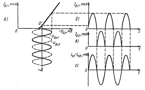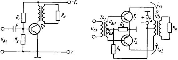 В том случае, когда необходимо получить выходную мощность более 5 Вт, применяют двухтактные усилители, собранные на двух транзисторах или двух лампах. Рассмотрим работу такого усилителя на транзисторах (рис. 29). Усилитель состоит из двух одинаковых половин, каждая из которых аналогична усилителю, представленному на рис. 28. Особенность двухтактной схемы состоит в том, что ее можно использовать в таком режиме, когда ток покоя коллекторных цепей близок к нулю. Этот режим называется режимом В. При работе в таком режиме КПД усилителя может достигать 70 %. Рабочая точка 0' на входной характеристике должна располагаться в области токов базы, близких к нулю (рис. 30, а). В результате этого обе половины схемы работают поочередно, причем каждая открывается во время действия положительных полупериодов входных напряжений uвх 1 и uвх 2, так как они сдвинуты по фазе на 180˚. Импульсы тока баз и коллекторов также сдвинуты на 180˚ (рис. 30, б, в). При этом в магнитопроводе Тр2 образуется магнитный поток, близкий к синусоидальному, так как через первичную обмотку трансформатора проходит ток