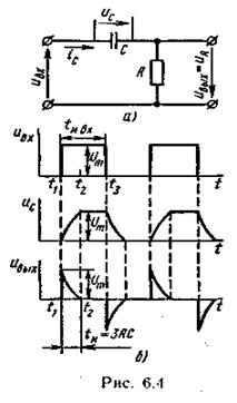 Выражение (6.9) соответствует выражению (6.7). Соотношение u вых «u вх» u Cвыполняется в том случае, если сопротивление R много меньше величины реактивного сопротивления конденсатора, т.е. R « 1/(w С) (для сигнала синусоидальной формы) и R « 1/(wв С), где wв — частота высшей гармоники импульсного сигнала. Следовательно, для получения дифференцирующей RС -цепи необходимо выбирать элементы R и С достаточно малыми так, чтобы выдерживалось соотношение RC «Т, где Т — период входного напряжения. Рассмотрим физические явления в емкостной дифференцирующей цепи для случая, когда на вход цепи воздействует периодическая последовательность импульсов прямоугольной формы (рис. 6.4, 6). В момент времени t 1напряжение на входе цепи скачком достигает значения u вх = U m. Учитывая, что напряжение на конденсаторе времени мгновенно измениться не может и равно в начальный момент нулю (рис. 6.4, б), все входное напряжение прикладывается к сопротивлению R (u вых = и R= U m). В дальнейшем конденсатор С заряжается в течение времени t 1 < t < t 3 экспоненциально убывающим током (см. рис. 6.3, б), определяемым выражением (6.5). При этом напряжение на конденсаторе увеличивается, а на резисторе R уменьшается [формулы (6.3), (6.4)] так, что в каждый момент времени сумма напряжений на конденсаторе и резисторе равна приложенному напряжению, т.е. и C+ u r= U m . Через промежуток времени t≥ 3 RС (момент времени t 2) конденсатор зарядится практически до напряжения, равного приложенному напряжению U m, u rстанет равным нулю, а зарядный ток прекратится. Этим заканчивается формирование выходного положительного остроконечного импульса длительностью t и» 3 RC, имеющего конечную амплитуду U m . Теперь конденсатор начинает разряжаться. Его напряжение полностью приложено к резистору R. Так как в первый момент времени это напряжение равно U m,то через резистор идет начальный ток разряда конденсатора i C = U m/ R. Направление тока разряда противоположно направлению зарядного тока, поэтому полярность напряжения на резисторе изменяется. По мере разряда конденсатора напряжение на нем уменьшается, а вместе с ним уменьшается падение напряжения на резисторе R. В результате формируется импульс отрицательной полярности той же длительности, так как постоянная времени цепи разряда равна постоянной времени цепи заряда. Результат воздействия последующих импульсов периодической последовательности аналогичен приведенному. Таким образом, дифференцирование сопровождается укорочением длительности импульсов.