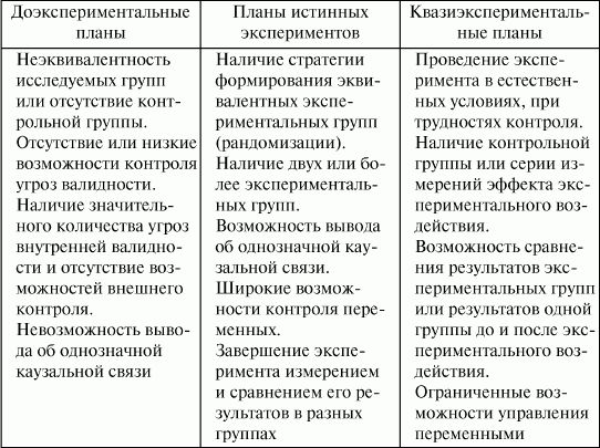 При описании экспериментальных планов будем пользоваться символизацией, предложенной Д. Кэмпбеллом: R – рандомизация; X – экспериментальное воздействие; O – тестирование. К доэксперименталъным планам относятся: 1) исследование единичного случая; 2) план с предварительным и итоговым тестированием одной группы; 3) сравнение статистических групп. При исследовании единичного случая однократно тестируется одна группа после экспериментального воздействия. Схематично этот план можно записать в виде: X O Контроль внешних переменных и независимой переменной полностью отсутствует. В таком эксперименте нет никакого материала для сравнения. Результаты могут быть сопоставлены лишь с обыденными представлениями о реальности, научной информации они не несут. План с предварительным и итоговым тестированием одной группы часто применяется в социологических, социально-психологических и педагогических исследованиях. Его можно записать в виде: O1 XO2 В этом плане отсутствует контрольная группа, поэтому нельзя утверждать, что изменения зависимой переменной (разница между O1 и O2), регистрируемые в ходе тестирования, вызваны именно изменением независимой переменной. Между начальным и итоговым тестированием могут произойти и другие «фоновые» события, воздействующие на испытуемых вместе с независимой переменной. Этот план не позволяет контролировать также эффект естественного развития и эффект тестирования. Сравнение статистических групп будет точнее назвать планом для двух неэквивалентных групп с тестированием после воздействия. Он может быть записан в таком виде: XO1 O2 Этот план позволяет учитывать эффект тестирования, благодаря введению контрольной группы контролировать ряд внешних переменных. Однако с его помощью невозможно учесть эффект естественного развития, так как нет материала для сравнения состояния испытуемых на данный момент с их начальным состоянием (предварительное тестирование не проводилось). Для сравнения результатов контрольной и экспериментальной групп используют t-критерий Стьюдента. Однако следует учитывать, что различия в результатах тестирования могут быть обусловлены не экспериментальным воздействием, а различием в составе групп. Квазиэкспериментальные планы являются своеобразным компромиссом между реальностью и строгими рамками истинных экспериментов. Существуют следующие типы квазиэкспериментальных планов в психологическом исследовании: 1) планы экспериментов для неэквивалентных групп; 2) планы с предварительным и итоговым тестированием различных рандомизированных групп; 3) планы дискретных временных серий. План эксперимента для неэквивалентных групп направлен на установление причинно-следственной зависимости между переменными, однако в нем отсутствует процедура уравнивания групп (рандомизация). Этот план может быть представлен следующей схемой: O1 X O2 O3 O4 К проведению эксперимента в данном случае привлекаются две реальные группы. Обе группы тестируются. Затем одна группа подвергается экспериментальному воздействию, а другая – нет. Затем обе группы повторно тестируются. Результаты первого и второго тестирования обеих групп сопоставляют, для сравнения используют t-критерий Стьюдента и дисперсионный анализ. Различие O2 и O4 свидетельствует о естественном развитии и фоновом воздействии. Дл