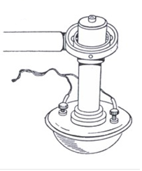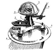 Рис. 5. Термоэлектрический пиранометр Янишевского. 1 — винты для установки уровня, 2 — уровень, 3 — винт, 4 — термоэлектрическая батарея, 5 — стеклянный колпак, 6 — трубка для установки теневого экрана.