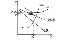 Фірма буде максимізувати свої прибутки, виробляючи такий обсяг продукції, який відповідає точці перетину кривих граничних витрат і граничного виторгу. Фірма з графіка 12.2. виробляє обсяг продукції Q, призначає ціну P і отримує економічний прибуток. Проте може скластися менш сприятлива ситуація з витратами і попитом, за якої фірма в умовах монополістичної конкуренції зазнає збитків у короткостроковому періоді.