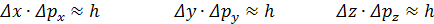 где Δx, Δу и Δz — неопределенности координат частицы по осям ОX, ОY, ОZ; Δрх, Δру, Δрz — неопределенности проекций импульса частицы по тем же осям, микрочастица не может иметь одновременно определенную координату (x,y,z) и определенную соответствующую проекцию импульса (рх, ру, рz). Соотношение неопределенностей допускает обращение в нуль неопределенности одной из величин, например Δр=0. Это означает, что частица имеет строго определенное значение импульса р (или скорости υ), но тогда Δх=∞. Следовательно, положение частицы на оси ОX (ее координата) становится совершенно неопределенным: частицу можно обнаружить в любом месте на оси ОX в пределах от 0 до ∞. В связи с тем, что у макроскопических тел волновые свойства не обнаруживаются, соотношение неопределенностей не накладывает для таких тел никаких ограничений на возможность определения их координат и импульсов. Макроскопическое тело, движущееся по оси ОX, может одновременно иметь точные значения координаты и импульса.