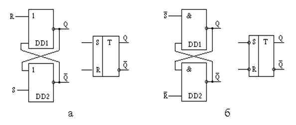 RS-триггер - это триггер с раздельной установкой состояний логического нуля и единицы (с раздельным запуском). Он имеет два информационных входа S и R. По входу S триггер устанавливается в состояние Q=l (/Q=0), а по входу R - в состояние Q = О (/Q = 1). Асинхронные RS-триггеры. Они являются наиболее простыми триггерами. В качестве самостоятельного устройства применяются редко, но являются основой для построения более сложных триггеров. В зависимости от логической структуры различают RS-триггеры с прямыми и инверсными входами. Их схемы и условные обозначения приведены на рис. 2.37. Триггеры такого типа построены на двух логических элементах: 2 ИЛИ-НЕ - триггер с прямыми входами (рис. 2.37, а), 2 И-НЕ - триггер с инверсными входами (рис. 2.37, б). Выход каждого из логических элементов подключен к одному из входов другого элемента, что обеспечивает триггеру два устойчивых состояния.