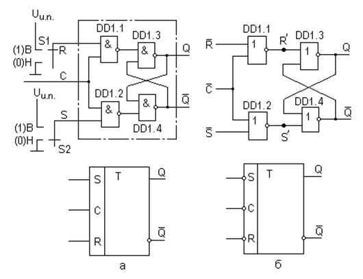 Синхронный двухступенчатый RS-триггер (master-slave, что переводится «мастер-помощник») состоит из двух синхронных RS-триггеров и инвертора, рис. 2.41, а. Входы С обоих триггеров соединены между собой через инвертор DD1.1. Если C=1, то первый триггер функционирует согласно сигналам на его входах S и R. Второй триггер функционировать не-может, т. к, у него C=0. Если C=0, то первый триггер не функционирует, а для второго триггера C=1, и он изменяет свое состояние согласно сигналам на выходах первого триггера.