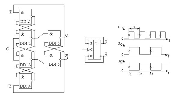 Аналогичным образом Т-триггер может быть собран на синхронном двухступенчатом RS-триггере.