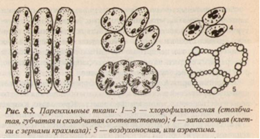 чают два вида механической ткани: колленхиму и склеренхиму, (рис. 8.4). Колленхима представлена живыми паренхимными клетками с неравномерно утолщенными оболочками, делающими их особенно хорошо приспособленными для укрепления молодых растущих органов. Будучи первичными, клетки колленхимы легко растягиваются и практически не мешают удлинению той части растения, в которой находятся. Обычно колленхима располагается отдельными тяжами или непрерывным цилиндром под эпидермой молодого стебля и черешков листьев, а также окаймляет жилки в листьях двудольных. Иногда колленхима содержит хлоропласты. Склеренхима состоит из вытянутых клеток с равномерно утолщенными, часто одревесневшими оболочками, содержимое которых отмирает на ранних стадиях. Оболочки склеренхимных клеток обладают высокой прочностью, близкой к прочности стали. Эта ткань широко представлена в вегетативных органах наземных растений и составляет их осевую опору. Различают два типа склеренхимных клеток: волокна и склереиды. Волокна — это длинные тонкие клетки, обычно собранные в тяжи или пучки (например, лубяные или древесинные волокна). Склереиды — это округлые мертвые клетки с очень толстыми одревесневшими оболочками. Ими образованы семенная кожура, скорлупа орехов, косточки вишни, сливы, абрикоса; они придают мякоти груш характерный крупчатый характер. Основная ткань, или паренхима, состоит из живых, обычно тонкостенных клеток, которые составляют основу органов (откуда и название ткани). В ней размещены механические, проводящие и другие постоянные ткани. Основная ткань выполняет ряд функций, в связи с чем различают ассимиляционную (хлоренхиму), запасающую, воздухоносную (аэренхиму) и водоносную паренхиму (рис. 8.5). Клетки ассимиляционной ткани содержат хлоропласты и выполняют функцию фотосинтеза. Основная масса этой ткани сосредоточена в листьях, меньшая часть — в молодых зеленых стеблях. В клетках запасающей паренхимы откладываются белки, углеводы и другие вещества. Она хорошо развита в стеблях древесных растений, в корнеплодах, клубнях, луковицах, плодах и семенах. У растений пустынных местообитаний (кактусы) и солончаков в стеблях и листьях имеется водоносная паренхима, служащая для накопления воды (например, у крупных экземпляров кактусов из рода карнегия в тканях содержится до 2—3 тыс. л воды). У водных и болотных растений развивается особый тип основной ткани — воздухоносная паренхима, или аэренхима. Клетки аэренхимы образуют крупные воздухоносные межклетники, по которым воздух доставляется к тем частям растения, связь которых с атмосферой затруднена.