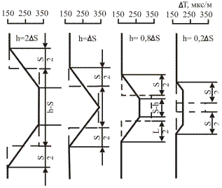 Криві Т 1, Т 2, Δ Т, які не задовольняють жодної умови, є спотвореними та інтерпретації не підлягають. Найбільш важливий недолік кривої Δ Т п – наявність помилкових аномалій (“викидів”), що іноді виходять за межі інтервалу Δ Т п.min-Δ T п.max. б) Визначення границь пластів. Крива інтервального часу реєструється в лінійному масштабі так, що величина Δ Τ п зростає зліва направо. Крива затухання a реєструється в лінійному або логарифмічному масштабі. Таким чином, породи з високою пористістю і підвищеним поглинанням енергії хвиль відзначаються на фоні порід, що вміщують пласт, максимумами на кривих Δ Τ п і a. Аномалії зазначених параметрів симетричні відносно середини пласта. Його границі при будь-якому співвідношенні розміру зонда L і товщини пласта h знаходять по точках, які зміщені на відстань S /2 від початку аномалії до середини пласта (Рис. 12.2).