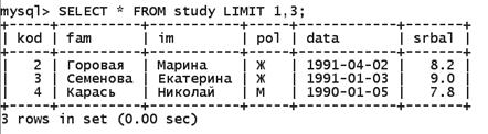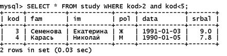 Рис. 6. Результат выполнения запроса из листинга 15 Ограничение набора выбираемых командой SELECT записей производится с помощью предложения WHERE, которым определяется набор выбираемых строк. В качестве критериев можно задавать цифровые значения, значения типа ДАТА, а также комбинации значений и даже арифметические операторы. Оператор where применяется в команде select точно так же, как и в команде delete. Выберем из таблицы study только те записи, у которых значение kod больше 2 и меньше 5 (листинг 16). Листинг 16. Задание условий в команде select mysql>SELECT * FROM study WHERE kod>2 and kod<5; Результат показан на рис.7.