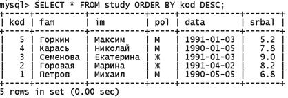 Листинг 18. Сортировка результатов запроса по убыванию mysql>SELECT * FROM study ORDER BY kod DESC;