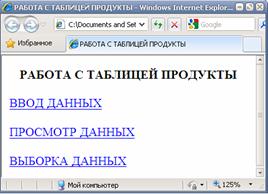 <html> <head> <title>РАБОТА С ТАБЛИЦЕЙ ПРОДУКТЫ</title> </head> <body> <p align="center"><b>РАБОТА С ТАБЛИЦЕЙ ПРОДУКТЫ</b></p> <!--гиперссылка открывает страницу с именем 1.htm с формой для заполнения полей таблицы--> <p><a href="1.htm>ВВОД ДАННЫХ</a></p> <!--гиперссылка открывает скрипт php, который выполняет просмотр записей таблицы--> <p><a href="view_table.php">ПРОСМОТР ДАННЫХ</a></p> <!--гиперссылка открывает страницу с именем 3.htm с формой для задания условий поиска записей таблицы--> <p><a href="3.htm">ВЫБОРКА ДАННЫХ</a></p> </body> </html>