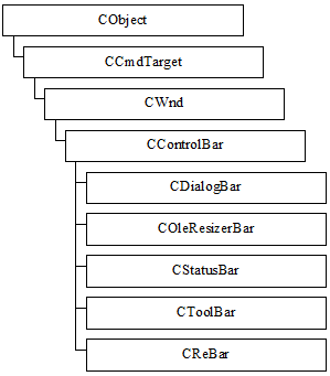 Відповідно до приведеної ієрархії класів, панель керування є вікном, і може містити дочірні вікна, які можуть отримувати та відправляти повідомлення (комбінований список COMBO BOX, текстове поле EDIT) або тільки керуватися програмою (кнопки з малюнком BITMAP BUTTONS, ділянка рядка стану STATUS BAR PANES). Базові функціональні можливості для всіх типів панелей елементів керування подібні – всі їх об’єкти є дочірніми вікнами деякої батьківської рамки. Панель керування може бути фіксованою (dockings) біля довільного боку її батьківської рамки або плаваючою (floating), що визначається встановленням відповідного стилю. Крім того, об’єкти CControlBar можуть самостійно позиціонуються при зміні розмірів батьківської рамки. Так як клас CControlBar є абстрактним, об’єктів на основі нього створювати не можна. Панелі керування створюються на основі дочірніх класів. До методів які реалізовані в класі CControlBar та часто використовуються відносяться: