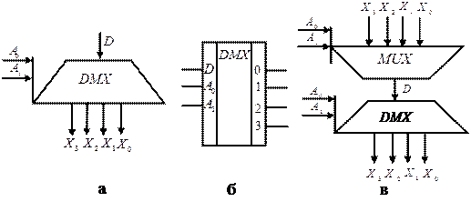 Рис. 3.11. Умовні графічні позначення демультиплексорів: а – на функціональних схемах; б – на принципових схемах; в – типове з'єднання з мультиплексором де D – інформаційний вхід; Логіка роботи демультиплексора на чотири входи представлена в таблиці 3.7.