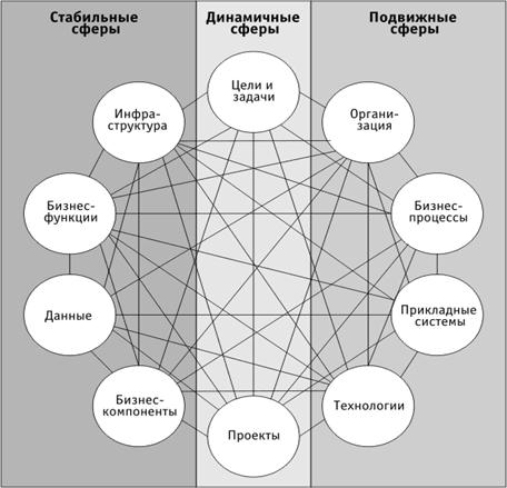 Внутри каждой области интересов сохраняется информация о какой-то определенной предметной области, что обеспечивает простоту сопровождения и извлечения этой информации. Обычно применяется одна или более иерархическая структура, которые напоминают ящик с файлами. Минимальный объем информации, относящейся к какой-либо сфере, называется элементом (member). Например, элементами сферы "Местоположение" могут быть "Головной офис", "Офис продаж в санкт-Петербурге", "Завод в Волоколамске" и т.д. Другими примерами элементов различных сфер являются: · Конкретные подразделения, например, "Отдел продаж" в сфере "Организация". · Конкретные бизнес-процессы, например, "Прием заказа" в сфере "Бизнес-процессы". · Конкретные информационные объекты, такие как "Клиент" в сфере "Данные". В принципе, наименования сфер говорят сами за себя. Отметим только, что под бизнес-компонентами понимается совокупность данных и тех бизнес-функций, которые создают, читают, обновляют и удаляют эти данные. Группировка всех функций, создающих и обновляющих одни и те же элементы данных с помощью процесса под названием "коммутативная кластеризация" позволяет определить неизбыточное количество "строительных блоков" – компонент – которые могут использоваться для построения систем и приложений, поддерживающих определенные бизнес-процессы. Компоненты являются важными конструкциями в современных подходах к разработке систем. Достаточно вспомнить про сервис-ориентированную архитектуру SOA и архитектуру MDA, основанную на моделях. Объединение (инкапсуляция) функциональности и данных позволяет на практике добиться повторного и многократного использования элементов систем и дает возможность замены одних элементов другими. Компоненты предлагают "сервисы", которые могут использоваться в совокупности с другими сервисами, предлагаемыми другими компонентами в рамках сервис-ориентированной архитектуры. Важное замечание, отраженное на нашем рисунке, состоит в том, что можно выделить три категории сфер: · Стабильные. Эти сферы описывают достаточно стабильные элементы бизнеса и представляют фундаментальные структуры: бизнес-функции, данные, бизнес-компоненты и инфраструктуру. · Подвижные. Эти сферы описывают то, что предприятие делает или может делать с точки зрения бизнеса, в том числе для того чтобы обеспечить отличия от конкурентов и динамичность в своей деятельности. Сферы, которые относятся к этому разделу – организация, бизнес-процессы, прикладные системы и технологии – представляют собой области, которые организация может изменить достаточно быстро. Эти сферы могут, на самом деле, находиться в процессе постоянных изменений, для того чтобы обеспечить адекватную реакцию на экономические и рыночные условия. · Динамичные. Это те сферы, которые задают направления бизнеса, рабочие программы, управление изменениями. Они описывают основные области, в которых работает предприятие, и усилия, которые требуются для движения в сторону достижения целей и задач посредством связанных между собой проектов. Эта классификация позволяет: во-первых, понимать, какая часть архитектуры вашего предприятия носит достаточно стабильный характер, а какая требует постоянных изменений; во-вторых, это помогает идентифицировать достаточно стабильные области, для которых полезна разработк