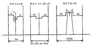 З метою забезпечення охорони електричних мереж, створення необхідних умов для їх експлуатації та попередження нещасних випадків від впливу електричного струму постановою Кабінету Міністрів України від 04.03.97р. № 209 були затверджені Правила охорони електричних мереж. Електричними мережами, які підлягають охороні згідно з Правилами, вважаються: трансформаторні підстанції; розподільні пункти і пристрої; струмопроводи; повітряні лінії електропередачі; підземні і підводні кабельні лінії електропередачі і споруди, які до них належать. Для створення нормальних умов експлуатації електричних мереж, забезпечення Їх збереження та дотримання вимог безпеки здійснюються такі заходи: відводяться земельні ділянки; встановлюються охоронні зони; визначаються мінімально допустимі відстані; прокладаються просіки у лісових, садових, паркових та інших багаторічних насадженнях. Для захисту населення від впливу електричного поля встановлюються санітарно-захисні зони повітряних ліній електропередачі напругою 330 кВ і вище. На період будівництва та експлуатації електричних мереж земельні ділянки надаються забудовникам відповідно до Земельного кодексу України. У межах охоронних зон землі у їх власників та користувачів не вилучаються, а використовуються з обмеженнями, передбаченими Правилами охорони електричних мереж. Охоронні зони електричних мереж встановлюються: уздовж повітряних ліній електропередачі - у вигляді земельної ділянки і повітряного простору, обмежених вертикальними площинами, що віддалені по обидві сторони лінії від крайніх проводів при невідхиленому їх положенні на відстань: 2м- для ПЛ до 1 кВ 10 м - для ПЛ до 20 кВ 15 м - для ПЛ 35 кВ 20 м - для ПЛ 110 кВ 25 м - для ПЛ 154, 220 кВ ЗО м - для ПЛ 330. 400, 500 КВ 40 м - для ПЛ 750 кВ;