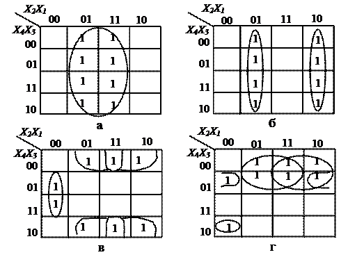 Рис. 3.21. Карта Карно для функцій перетворювача прямого коду в доповняльний код: а – Y1; б – Y2; в – Y3; г – Y4 На основі карт Карно з урахуванням знакового розряду ХЗН прямого коду для функцій Y 1 Y 2 Y 3 Y 4, що представляють виходи перетворювача, отримуємо: