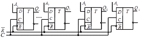 Регістри класифікують за наступними ознаками: · способом управління записування – асинхронні і синхронні; · способом записування і видачі двійкових слів – паралельні, послідовні й універсальні; у паралельних регістрах записування і видача слів проводиться одночасно всіма розрядами, а в послідовних – розряд за розрядом в напрямку від молодших розрядів до старших або навпаки; універсальні регістри забезпечують як паралельний, так і послідовний обмін інформацією; · числом ліній для представлення значення одного розряду слова (біта інформації) – однофазні і парафазні; при однофазному представленні значення кожного розряду слова передається по одній лінії зв'язку, а при парафазному – по двох лініях (одночасно відображається пряме і інверсне значення розряду); · числом тактів для записування слова – одно-, двух- і багатотактні; · складом виконуваних мікрооперацій – установлювальні, записування, зчитування, порозрядні логічні і зсув, а також перетворення послідовного коду в паралельний і навпаки; · напрямоком зсуву – односторонні (зсув ліворуч або праворуч) і двосторонні (реверсивні); · типом використовуваних тригерів (RS, D, JK); · елементною структурою – потенційні, імпульсні і потенційно імпульсні.