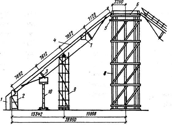 Рис. 6.13. Монтаж просторового покриття 1 - нижня опора; 2 - трубчаті риштування; 3 – попередньо напружений елемент;4 - кроква підсилена шпренгелем; 5 - гідравлічний домкрат; 6 - опорне кільце;