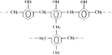 Новолачные смолы представляют собой смесь макромолекул с молекулярными массами от 200 до 1200. В зависимости от молекулярной массы новолака значение n может изменяться от 4 до 8. Если конденсацию проводят в щелочной среде при избытке формальдегида, то получают термореактивные (резольные) смолы, содержащие свободные метилольные группы: В начальной стадии поликонденсации, когда молекулярная масса равна 70, 100, резольные смолы легко плавятся и растворимы в органических растворителях, например, в этиловом спирте. При растворении резолов образуются так называемые бакелитовые лаки, клеи (например, клей БФ). При дальнейшей поликонденсации (например, при повышении температуры в процессе прессования) резолы превращаются в неплавкие и нерастворимые резиты, имеющие трехмерное сетчатое строение: