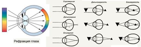 Существуют другие нарушения рефракци. Меопическая, возникает в результате удлинения злаза в переднем, заднем направлении. Из-за большей преломленной силы глаза, фокусное изображение получается перед сетчаткой, а на сетчатке круги светорассеивания. Гиперметропическая укорочение длинны глаза. При этом фокус за сетчаткой. На сетчатке круги светорассеивания. Кроме них существует остегматизм, когда лучи коррегируются в разных мередианах по разному.