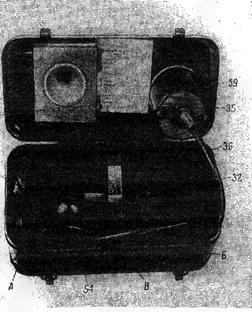 Доторкатися до оптичних деталей пальцями, масляним і брудним дранням забороняється, тому що самі незначні жирові плями руйнують поліровану поверхню скла, у результаті чого погіршується якість зображення. А - колиматор; Б- укладальна шухляда; В- місце для укладання запасних електролампочок: 32-дзеркало; 35-фішка; 36-провід; 54-кульова п'ята; 59-бленда; фланель; запасне дзеркало;