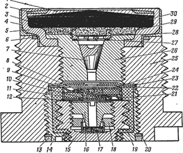 Рис. 4 Втулка ГУВ-7 1- кришка обтюратора: 2 - герметизуюча прокладка; 3 – закладення; 4 - манжета; 5 - обтюратор; 6 - прокладка: 7 - обтюруючий конус; 8 - місток накалювання: 9 - підпалювальний склад; 10 - пергаментний кружок; 11 – електроізолююча колодка; 12 - латунний кружок; 13 - підтискне кільце; 14 - затискна втулка; 15 - підстава; 16 - наковаленка; 17 - капсуль-підпалювач; 18 - гайка; 19 - ізолюючий шар; 20 - герметизуюча прокладка; 21 - нижній контакт; 22 - кришка; 23 - сталевий кружок; 24 - верхній контакт; 25 - корпус; 26 - гвинт; 27 - кільце; 28 - паперовий кружок; 29 - підсипання димного пороху; 30 - порохова петарда