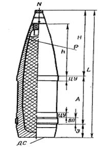 N-вершина снаряду; H- головна частина; A- циліндрична частина; З- запояскова частина; ДС- донний зріз; ЦУ- центруючи стовщення; ВП- ведучий пасок; Р- радіус обрису головної частини; L-повна довжина снаряду.