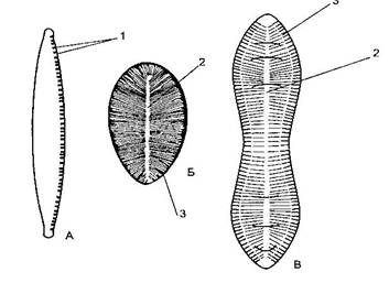 Рис. 5. Каналошовні діатомові водорості: А – Nitzschia palea; Б – Surirella brebissonii; В – Cymatopleura solea. 1 – кільові точки, 2 – осьове поле, 3 – крило