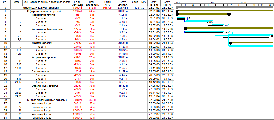 4. МР автоматически (как правило) пересчитывает все расписание работ, которое после введения случайных работ является стохастическим, и отображает его в выбранной форме календарного графика, как правило, графика Ганта. 5. Для расчета чистого дисконтированного дохода (NPV) стохастического и детерминированного денежных потоков вводятся стоимости всех работ и параметры доходного периода. 6. Для вычисления NPV используется формула (6), которая вводится в любые пользовательские столбцы, с названиями «Затраты1», «Затраты2», «Затраты3» и т.п. 7. Для набора необходимой статистики расчет новых случайных продолжительностей и их копирование в столбец «Продолжительность» повторяется.