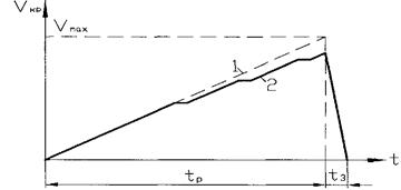 Рисунок 5.10 - Тахограма спуску незавантаженого талевого блоку: 1 - теоретична (спрощена); 2 - реальна; tр - час розгону; tз - час уповільнення
