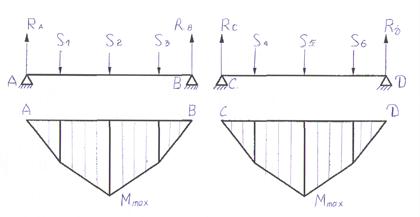 g - прискорення вільного падіння; Vкр.mах - максимальна швидкість спуску гака; tp - час розгону; Sp - шлях, пройдений талевим блоком при розгоні, його приймають Sp=0,8lсв. Вагу рухомих частин талевої системи вибирають так, щоб середня швидкість спуску незавантаженого талевого блоку складала 1,0-1,2 м/с. Вісь кронблока. На рис. 5.12 представлена розрахункова схема осі кронблока, виготовленого за схемою рис. 5.11. На схемі S1, S2, S6 - реакції опор шківів, Ra, Rв, Rс, RD- реакції осей відповідно в опорах А, В, С, D.