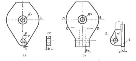 На рис. 5.16 представлено дві щоки талевого блоку, розрахунок яких здійснюють в перерізі А-В (і С-D) розраховують на розтяг. Поверхня розточування щоки за схемою (а) діаметром d0 - розраховують на контактний тиск. Нижня частина щоки з внутрішнім отвором r і зовнішнім R розраховується за формулою Ляме. Косинка 2, приварена до щоки розраховується на зріз зварного шва і згин. Провушина косинки - за формулою Ляме. Виходячи з діючого максимального моменту, визначають необхідний момент опору і розміри поперечного переріз у балки: W=