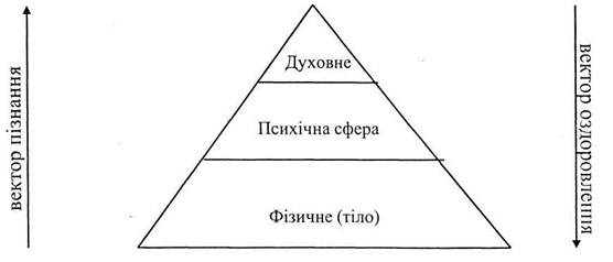 Схема № 1. Духовному аспектові як у західній, так і у нашій практиці оздоровлення поки що не надається належної уваги. В західній медицині лікар звичайно починає роботу з пацієнтом з наступного за ієрархією рівня, який визначає здоров'я, — із психічної сфери. Вітчизняна практика, на жаль, обмежується лікуванням тіла, а як наслідок — маємо багато хвороб, котрі перебувають у відомстві "вузьких" спеціалістів. Відповідно лікування проводиться "в межах органу" або системи органів, що не дає лікувального ефекту організмові. У той же час, виробляючи стратегію здоров'я, починати необхідно з оздоровлення всього організму, а тактику — з того рівня, який організовує всі інші, — духовного. На жаль, переважна більшість людей вважає, що з духовним здоров'ям у них усе гаразд, а всі неприємності пояснюють випадковими явищами нестійкого функціонування окремих систем чи органів, наприклад, кишечника, нирок, печінки тощо. Другий за ієрархією рівень — психічна сфера людини. Зі станом психіки, як відомо, пов'язаний стан тіла, що підтверджується наявністю психосоматичних захворювань, зокрема "хвороб адаптації"" тощо, які виникають при тривалому психоемоційному стресі, а також під впливом надмірних як негативних, так і позитивних психокомплексів. Інформація про історію пізнання людиною проблем власного здоров'я і способів його збереження дає конкретні уявлення про складний шлях, який пройшло людство, щоб зрозуміти взаємозв'язок компонентів духовного, психічного і фізичного в її оздоровленні. Лише в XVII ст. людина повірила у свій власний розум, у його можливості в управлінні її життям і здоров'ям. Усвідомлена, осмислена життєдіяльність характерна для сучасної людини. З кінця XIX ст. життя індивіда як біосоціальної істоти суттєво змінилося. Темп життя вийшов за межі можливого. Зникли загрози, до яких людина пристосовувалася тисячоліттями, виникли нові, проти яких вона не мала генетичного захисту. Науково-технічна революція докорінно змінила життя, його умови. Відповідно драматично змінилася й адаптація людини до реального життя. Вона перестала залежати від росту, фізичної сили і міцності кісток. Пристосування людини до дійсності в наш час залежить переважно від її психічних можливостей. Безмірно виросла ціна помилки, і приклад тому — Чорнобиль. Глибоко ранять не ікла хижака і не спис ворога, а слово. Негативні емоції, як дев'ятий вал, накрили людину з головою. Кількість інформації, яку одержує людина щоденно, величезна. Людина дезорієнтована. У стимулах, що викликають дистрес, психічне домінує над тілесним. Локальні м'язові напруження, котрі формуються при психокомплексах, сприяють виникненню патологічних процесів у внутрішніх органах. Тому в тактиці оздоровлення центром є психічна сфера. Комплекс оздоровчих методів,, що в першу чергу впливають на емоційно-інтелектуальну сферу, передбачає вміння працювати з різними галузями психіки (психоаналіз і психосинтез, нейролінгвістичне програмування, елементи гельштат- і тілесноорієнтованої психотерапії, дихальної техніки і психонавантаження тощо). Останній, нижчий за ієрархією рівень оздоровчих заходів — фізичний. Він включає: нормалізацію трофотропної функції (очищення органів і систем, нормалізація діяльності травної системи, харчування, сну), відновлення ерготропної функції за рахунок призначе