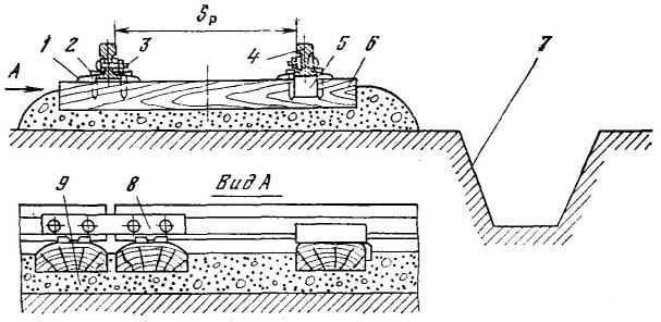Рис. 13.1. Элементы рельсового пути с деревянными шпалами: 1 — подкладка; 2 — костыль; 3 — болт; 4 — рельсы; 5 — противоугон; 6 — шпалы; 7 — водоотводная канава; 8 — накладка; 9 — балласт.