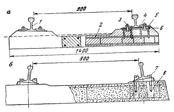 Рис. 13.2. Железобетонные шпалы: а – с быстроразъемным крепежным устройством; б - с креплением рельсов костылями; 1 – рельс; 2 – шпала; 3 – болт; 4 – накладка; 5 – резиновая прокладка; 6 – закладная деталь; 7 – костыль; 8 – деревянная пробка.
