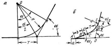 Задачей расчета является определение основных размеров, необходимых для проектирования. При расчетах дугу закругления заменяют комбинацией прямых линий, или двумя «тангенсами» (см. рис. 13.4, а), где: