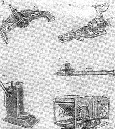 Рис. 13.5. Установка ПГИ-2 для механизации путевых работ: а – передвижная установка с набором инструмента; б – костылезабивщик; в – костылевыдвигатель; г – кусачки; д – рельсогибочный пресс; е – рельсосверлильный станок; ж – домкрат; з – рихтовщик; и – бункер-вагон.