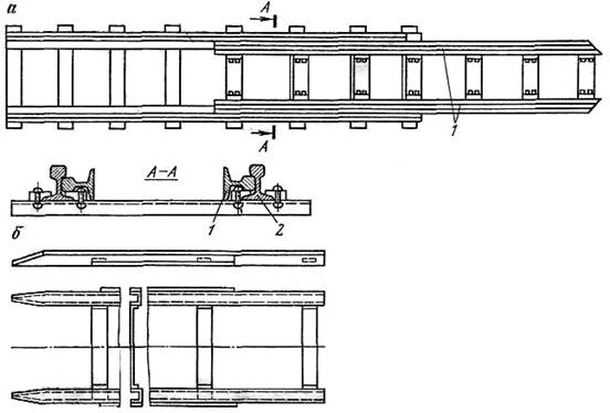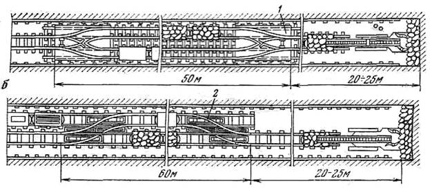 При проведении подготовительных выработок непосредственно у забоя настилают без балластного слоя временные рельсовые пути, которые представляют собой выдвижные рельсы (рис. 13.7, а), выдвижные рамки (рис. 13.7, б) или отдельные звенья отрезков рельсов длиной 1—2 м, закрепленных на металлических шпалах. При достижении отдельных звеньев временных путей стандартной длины рельсов вместо временных рельсовых путей настилают постоянные. Выдвижные рельсы укладывают повернутыми между рельсами ранее настланного пути. При уборке породы колеса погрузочной машины перемещаются по шейкам выдвижных рельсов. Выдвигание рельсов на подготовительный забой производят ковшом погрузочной машины. Выдвижная рамка, изготовленная из стального проката, равна ширине рельсовой колеи. При работе рамку накладывают на рельсы и колеса погрузочной машины при уборке породы перемещаются по рамке. Для обмена вагонеток при проведении выработок применяют стационарное путевое оборудование, устанавливаемое периодически через 50—100 м и более, и временное, которое располагают ближе к забою и перемещают вслед за продвижением подготовительного забоя. К стационарному путевому оборудованию относятся тупиковые и замкнутые разминовки, вертикальные вагоноперестановщики, перекатные роликовые платформы и др.