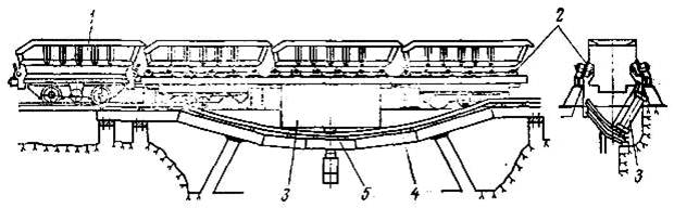 При подходе вагонетки к разгрузочной яме наружные плечи рычагов затворов взаимодействуют с шинами, днища освобождаются, ролики днищ опускаются на разгрузочные кривые. При дальнейшем движении вагонетки днища плавно открываются, и груз разгружается в яму. Закрывание днищ после их подъема на кривых осуществляется автоматически. Достоинством вагонеток с откидными днищами является быстрая разгрузка состава вагонеток на ходу, недостатками — наличие свободной (мертвой) зоны внутри бункера или разгрузочной ямы, так как при разгрузке днища опускаются между рельсами ниже головок последних на 0,7 — 0,9 м, что требует автоматического контроля заполнения бункера; заштыбовка разгрузочных кривых. Вагонетка типа ВДК (рис. 13.10, г) имеет более совершенную конструкцию. В этих вагонетках днища 2 клапанного типа открываются вдоль продольной оси кузова, при этом створки днища в открытом положении находятся выше головок рельсов. В закрытом положении шарнирно закрепленные днища удерживаются замковым рычажным устройством с пружинами, работающими на кручение. Разгрузка горной массы из вагонетки осуществляется при движении над бункером, при этом ролики 1, закрепленные на днищах 2, накатываются на лыжи открывающего устройства, замковые рычажные устройства освобождают днища, которые под действием собственного веса открываются, и горная масса высыпается в бункер. При дальнейшем движении вагонетки ролики 1 взаимодействуют с лыжей закрывающего устройства, и створки днища 2 закрываются. Вагонетки типа ВДК разгружаются при скорости движения до 1,8 м/с, при этом исключается зависание горной массы в кузове вагонетки. Эти вагонетки применяют не только для транспортирования угля, но и могут быть использованы при закладке породы в выработанное пространство на шахтах с крутым залеганием пластов и балластировке рельсового пути. При отсутствии разгрузочных шин затворы днищ можно открывать вручную. Вагонетки типов ВД и ВДК нельзя использовать для транспортирования крупнокусковой крепкой руды ввиду возможного в этом случае выхода из строя затворов днищ. Поэтому в рудных шахтах за рубежом находят применение вагонетки с шарнирно закрепленным на кузове днищем, на котором закреплены оси колес полускатов. При разгрузке над бункером кузов 1 (рис. 13.11) вагонетки своими боковыми направляющими перемещается по батареям стационарных роликов 2, при этом днище 3 раскрывается под действием собственного веса и груза. В процессе разгрузки ролик 5, закрепленный на днище, перемещается по разгрузочной кривой 4. После разгрузки днище, пройдя по разгрузочной кривой, закрывается, колеса полускатов переходят на рельсы, а кузов вагонетки сходит с батареи роликов. Для удержания днища в закрытом положении при перемещении вагонетки по