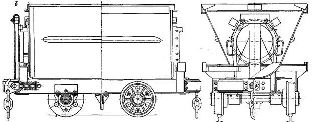 Рис. 13.12. Вагонетка с откидным бортом типа ВБ (а) и с глухим опрокидным кузовом типа ВО (б)