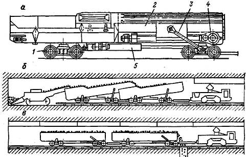 Рис. 13.14. Проходческий бункер-вагон: а — общий вид; б —в положении загрузки; в —в положении разгрузки; 1 — двухосная тележка; 2 — кузов; 3 — рычаги; 4 —привод донного скребкового конвейера; 5 — гидроцилиндр надвижки вагона.