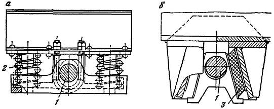 Рис. 13.15. Автоматизирующие подвески вагонеток: 1 – ось полуската вагонетки; 2 – пружины; 3 – резинометаллический амортизатор