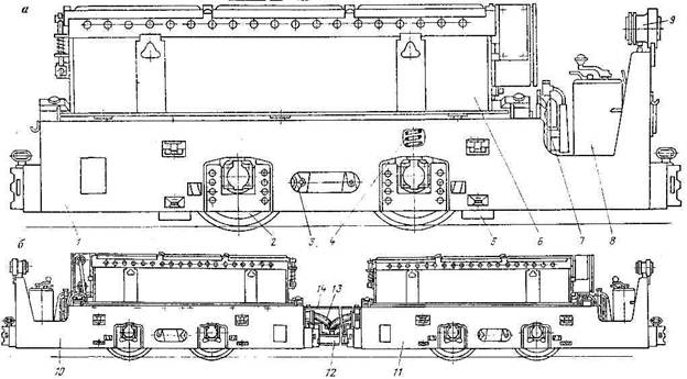 Рис. 13.17. Аккумуляторные электровозы: а — ЛЛ18Д; б — 2АМ8Д. 1 — рама; 2 — колесная пара с приводом; 3 — тормозная система; 4 — рессорная подвеска; 5 — песочная система; 6 -- аккумуляторная батарея; 7 — маховик привода ручного тормоза; 8 — контроллер; 9 — фара; 10 — первая секция; 11 — вторая секция; 12— сцепка; 13 — межсекциопное соединение; 14 — отключающий трос.