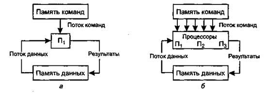 Рисунок 6.4- Архитектура ОКОД (SISD) (а) и архитектура МКОД (MISD) (б) Архитектура ОКОД (SISD) охватывает все однопроцессорные и одномашинные варианты систем, т. е. с одним вычислителем. Все ЭВМ классической структуры попадают в этот класс. Здесь параллелизм вычислений обеспечивается путем совмещения выполнения операций отдельными блоками АЛУ, а также параллельной работой устройств ввода-вывода информации и процессора. Закономерности организации вычислительного процесса в этих структурах достаточно хорошо изучены.