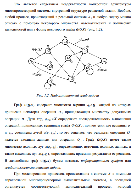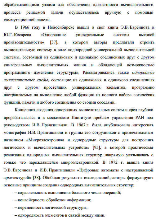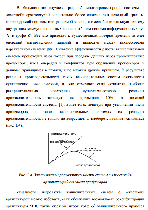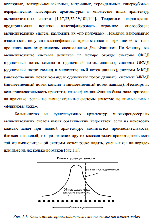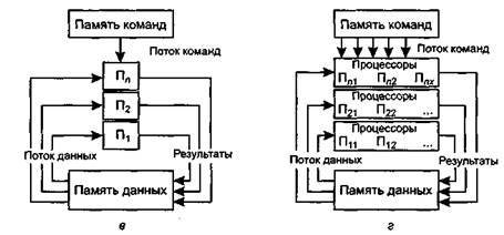 Рисунок 6.5- Архитектура МКОД (МISD) (в) и архитектура МКМД (MISD)(г) Архитектура ОКМД (SIMD) предполагает создание структур векторной или матричной обработки. Системы этого типа обычно строятся как однородные, т. е. процессорные элементы, входящие в систему, идентичны, и все они управляются одной и той же последовательностью команд. Однако каждый процессор обрабатывает свой поток данных. Под эту схему хорошо подходят задачи обработки матриц или векторов (массивов), задачи решения систем линейных и нелинейных, алгебраических и дифференциальных уравнений, задачи теории поля и др. Как правило, эти связи напоминают матрицу, в которой каждый процессорный элемент связан с соседними. По данной схеме строились системы: первая суперЭВМ — ILLIAC-1V, отечественные параллельные системы — ПС-2000, ПС-3000. Структуры ВС этого типа, по существу, являются структурами специализированных суперЭВМ. Элементы технологии SIMD реализованы в процессорах Intel начиная с Pentium MMX (1997 г.). Архитектура МКОД (MISD) предполагает построение своеобразного процессорного конвейера, в котором результаты обработки передаются от одного процессора к другому по цепочке. Выгоды такого вида обработки понятны. Прототипом таких вычислений может служить схема любого производственного конвейера. Конвейерная схема нашла применение в так называемых скалярных процессорах суперЭВМ, в которых они применяются как специальные процессоры для поддержки векторной обработки. Архитектура МКМД (MIMD) предполагает, что все процессоры системы работают по своим программам с собственным потоком команд. В простейшем случае они могут быть автономны и независимы. Такая схема использования ВС часто применяется на многих крупных вычислительных центрах для увеличения пропускной способности центра. Большой интерес представляет возможность согласованной работы ЭВМ (процессоров), когда каждый элемент делает часть общей задачи. Общая теоретическая база такого вида работ практически отсутствует. Подобные системы могут быть многомашинными и многопроцессорными. Например, отечественный проект машины динамической архитектуры (МДА) — ЕС-2704, ЕС-2727 — предполагал одновременное использование сотни процессоров.